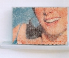 In einer parallelen Werkgruppe werden zerschnittene Wattestäbchen in durchlöcherte Aluminium gefädelt, um ein flaches Feld aus Watte-Enden zu erhalten, auf das das Bild geworfen wird. Das daraus entstehende Abbild - die aufpolierte, glatte und wächserne Büste einer Göttin des Hollywood-Kinos der 50er Jahre - ist klarer als jene auf dem heillosen Durcheinander der Peddigrohrbündel. Die Fragmentierung des Bildes ergibt sich hier auf eine ganz unterschiedliche Weise - ihre Wahrnehmung erfolgt durch das Zusammensetzen von Einzelpunkten, eine Verweis darauf, daß es sich hier nicht um Menschen, sondern um die Repräsentation von Menschen handelt, die wir normalerweise in der Punktmatrix-Abbildung des Zeitungsdruckverfahrens wahrnehmen. Die Rückseiten dieser Arbeiten bilden die abgeschnittenen Plastikstäbchen, die durch die Aufteilung der Farben einen groben Umriß des umseitigen Bildes ergeben. Sie enthüllen eine noch weiter dekonstruierte Interpretation des Bildes und entfernen es so noch weiter von ihren Repräsentationen.