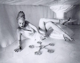 In elegant wide format, Barney's "Cremaster 5" exploits Budapest's enchanting Baroque sites, the chain(!) bridge and the Gellért Baths, no less than the economical conditions of production and, in appropriative derivation, the European history film.(22) If Walerian Borowczylc has Paloma ("the dove"!) Picasso, playing the Baroque Hungarian sado-Countess Erzébet Bathory, bathe in the blood of murdered virgins in "Contes Immoraux" (1974) and Patrice Chéreau casts face-lifted diva Virna Lisi as the hardly less bloodthirsty Catherine de Médicis in "La Reine Margot" (1994), the least Barney can do is to rescue Bond bee Ursula Andress, eternally young thanks to silicone and plastic surgery, from oblivion by having her embody the Queen of Chain in a Spanish ruff. And don't the ghosts of Lola Montès and Empress Sissi haunt Barney's nocturnal piece in the stars who once lent them their bodies? Are we not instantly reminded ,of Visconti's "Ludwig" (1972) in the exquisitely romantic encounter between queen and magician - even when submissive Domina pulls the spurs on to the magician's boots in sado-maso fashion before the latter chains himself stark naked to the saddle with an oversized scissors-like bit along with built-in, stiff plastic Mickey Mouse gloves?