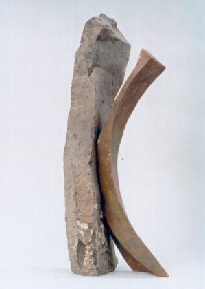 Eine zusätzliche Skulpturengattung erwartet uns: Ein zweiter Stein steht in einem "Duett' dem ersten Stein gegenüber. Eine innere Beruhigung und Stabilität tritt in diese Gegenüberstellung ein, welche selbst durch die Spannung des Metalls nicht vollständig aufgelöst wird.