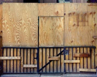 Mark WoodsUntitled (plywood security barrier clinging to ornamental wrought iron gate)