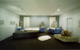 The Bedroom Ensemble dating from 1963 (from which the museum owns a replica from 1969 that the artist made for a retrospective of his works in the Hayward Gallery, London) was tailor-made by Oldenburg specially for a room in the Sidney Janis Gallery. The room in the gallery had the character of a flat. The walls were painted in a grey colour chosen by Janis himself, the floor was carpeted, in one of the walls were windows with drawn Venetian blinds and air-conditioning, a sign with the words "Private“ was fixed to a door. Oldenburg transferred all these details into his environment in the form of a complete ‘Living-Room’. All furnishings in the Bedroom radiate the coldness of stylized perfection which reminds us of advertisements [The „bedroom as a tomb“ (Oldenburg)]. The furniture in its entirety is formed out of synthetic materials. The large bed in the background has been made from black patterned vinyl, whilst the covers and the pillows are of the smooth white variety. The headboard, the beautifully draped cushions and the chair standing in the foreground on the right have been covered with synthetic materials imitating zebra skins. Oldenburg had the bedside tables and the dressing table produced in blue, marbled formica; the lampshades are made from marbled paper. The circular mirror on the dressing table has a deliberate dullness as if steamed up. The small objects, the radio, the powder boxes, the ash tray, the clock without hands are anonymous white things. The bedside rug emits sterile artificiality. The printed fabric stretched over the frames hanging on the walls is a standardised version, suitable for the consumer, of abstract-expressionist painting hinting at the work of Jackson Pollock. Together with the synthetic imitation of a leopardskin coat and a black patent handbag on the chair it epitomizes the height of an ideal, American, middle-class lifestyle. All the furniture and objects are without a function, they are ‘dead’ objects. They radiate coldness and uniformity. Everything seems to be frozen within a timeless room. The furniture, informalistic alienation, is a group of parallelograms which protrude aggressively into the room, the forms of which the artist had based on advertising leaflets corresponding to the repelling, overstylized materials. Oldenburg used some of the advertisment illustrations upon which the furnishings were based to make collages which are hanging on the opposite wall of the room. The materials and the alienated forms allow the bedroom to become the projected idea of a bedroom. The materials have optical but no haptic qualities thus excluding any possible erotic feeling. The perspectively distorted pieces of furniture may be ‘abstractions’ of objects, but it is exactly due to their making the subjectivity of awareness apparent, that we gain a sharpened perception of the human ‘perspecitve’ as one which is determined by particular regularities. The work’s real reference to the living world of the sixties is offset to some extent through the marked anonymity and ‘timelessness’ of the room and it is brought back again and again into the viewer’s present time. Due to this, the viewer projects that which he perceives into his own living world and reflects upon it.