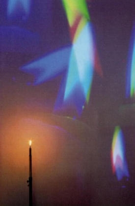Es entsteht ein immaterielles, elektronisches Bild, wobei die Wände zu Projektionsflächen werden. Der Ausstellungsraum ist voller Bewegung durch das farbig reproduzierte und vergrößerte Bild des leicht flackernden Kerzenlichts. Das Video-Bild zeigt ein nicht reproduzierbares Bild, also keine Filmkonserve. Die Farbpaletten sind die Bildröhren der Video-Projektoren: Rot, Blau, Grün und ihre Mischfarben. Sie erscheinen wie bengalisches Licht. Die drei Video-Grundfarben sind nicht wie üblich deckungsgleich aufeinander justiert, sie sind vielmehr bewußt versetzt, sogar gekippt zu einander eingestellt, so daß die Kerzenflamme jeweils dreimal erscheint.