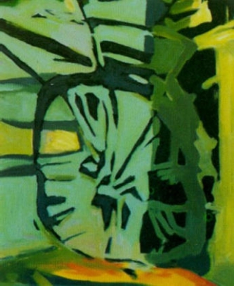 „Ich habe die Serie, die ich "von den Fahrrädern" nenne, ausgewählt. Die Idee dazu entstand, als ich einige Radierungen einer Freundin zugeschickt bekam und spontan gefühlt habe, daß ich spezielle Teile dieser Bilder getrennt aus ihrem bisherigen Zusammenhang herausnehmen könnte, um sie in einem neuen Bild weiterwirken zu lassen. Diese Idee hat mir gut gefallen, da ich mich thematisch gerade mit den Spuren, die Menschen hinterlassen, beschäftige.