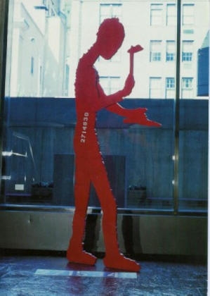 Jonathan Borofsky's Hammering Man tells us, as in a fairy-tale, that the individual can do almost anything, but that he cannot go beyond his own physical clock. The rhythm of his breathing determines the rhythm of his work and even measures the rhythm of his life. The Hammering Man is a simile. On the other hand, the Hammering Man demands the attention of the public.