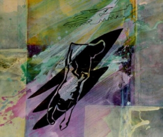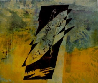 Wenn ich jetzt mit einem Bild anfange zu arbeiten, mit einer bestimmten Farbe mit einer bestimmten Stofflichkeit umgehe, die ich werfen kann, die ich gießen kann, ich kann das Bild kippen, ich kann mit dem Lappen darübergehen. Kurzum, es werden Effekte entstehen die ich vorher nicht weiß aber ungefähr weiß ich ja was passiert, da man ja auch Erfahrung sammelt und man kann deswegen auch gestalten. Der Zufall steht am Anfang. Am Ende steht eine schwarzweiße Zeichnung. Das ist etwas ganz Konkretes, etwas, das ins Auge sticht, wenn wir das Bild sehen. Und das Bild zerfällt in verschiedene Ebenen: in etwas, was man vorne sieht und das, was man eigentlich nach und nach lernt zu sehen, was dahinter steht. Und das war der Zufall. Da sind verschiedene Schichten, verschiedene Farben, die ihr Eigenleben haben und sozusagen ihre eigene Form. Man könnte sich davorstellen und die einzelne Schicht lesen lernen: das ist so und so gemacht und das ist so und so gemacht.