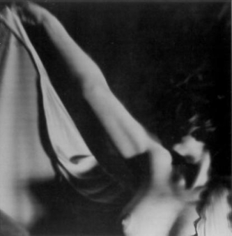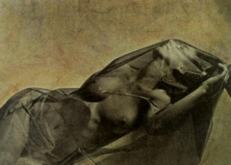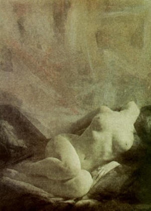 Un élément très important pour la réalisation de cette jonction est la création d'un nouvel espace de l'image relié par la fusion du corps avec son environnement. On pourrait prendre l'excellent exemple de la page 50, où l'image d'un torse, visible des genoux aux épaules, les mains jointes, le front encadré par des draps aux plis marqués, fait-fonction du repoussoir classique, d'élément qui crée la profondeur dans l'espace. C'est là que l'espace se diffuse, se brise presque en style cubiste, en superficies éclairées et sombres qui viennent se superposer à la figure planante et l'intégre à l'espace. La figure n'est plus debout dans l'ensemble de l'image, quoiqu'elle le soit sans aucun doute par la posture originale. Mais elle est révoquée par le fait qu'elle est légèrement tournée vers la diagonale de l'image et qu'elle est prise par en-dessous. C'est ce qui la rend proche des anges des peintures des plafonds baroques. Il est evident que les tirages au platinum-palladium, avec leurs tonalités et couleurs particulières sont plus proches des techniques picturales et graphiques que de la photographie avec sa précision et sa surface lisse. Emergent de notre mémoire les oeuvres des grisailles, cette peinture de gris en gris qui, commençant avec Giotto et se poursuivant avec Dürer et Jan Van Eyck servait, surtout à I'époque du baroque, à représenter des sculptures et à donner l'illusion de tridimensionalité dans un contexte architectural. Cette illusion fait surtout comprendre de la page 58 nu couché vu de dos le, la hanche fortement pliée et dont l'arrière-plan à gros grains est indéfini et se fond dans le support qui donne de l'appui au corps. La tête méme commence à s'imprégner de cette surface granuleuse et se mêle à l'arrière-plan.C'est ce qui fait que, à cause des contours doux, le corps se distingue de la surface de l'image comme un bas-relief: le dos et les fesses, avec leur surface risse et ronde, se distinguent des alentours amorphes. Ainsi, la photographie tirée au platinum-palladium réalise le méme effet que la grisaille classique. Une impression identique est obtenue pour les pages 57, 59 ou 77.
